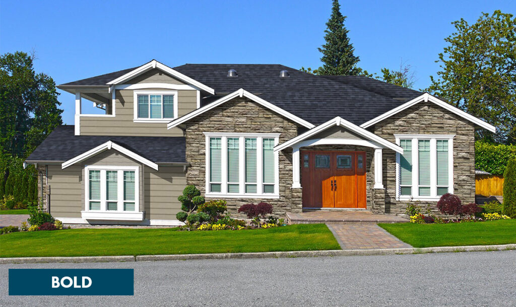 For a dramatic exterior, select striking, high-contrast siding and roofing colors. They don’t have to be bright and bold colors, however. For a more subtle exterior, choose colors that are similar and offer less contrast.