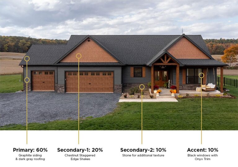 Exterior designers rely on the 60/30/10 color theory to create a balanced design with siding colors. The theory is broken down into Primary, Secondary, and Accent colors.