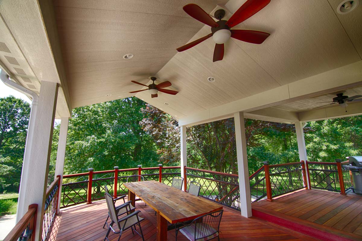 The deck makes a perfect outdoor living space featuring White Pro-Post Wraps and No Groove Paneling on the ceiling.