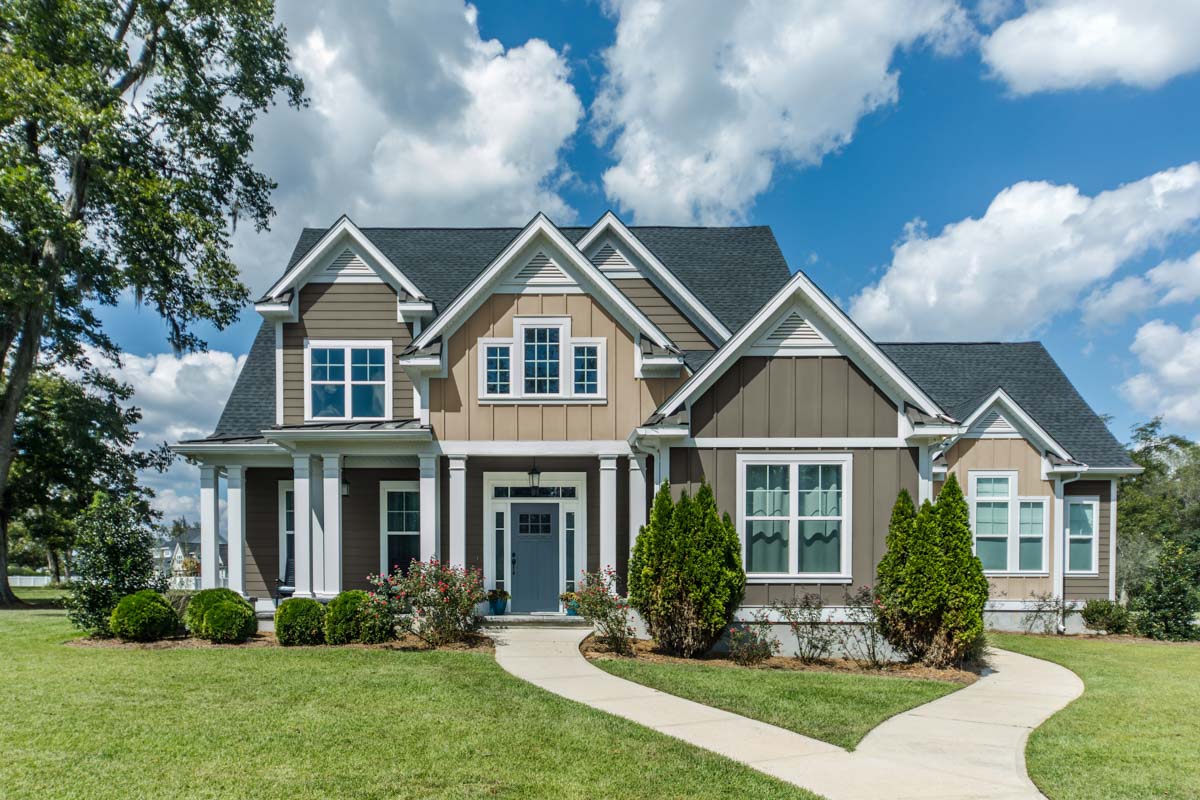 This contemporary style home gets a coastal vibe from a beachy color palette! This home features RigidStack lap siding in Terra Bronze and Board & Batten Siding in Sand with custom color trim.