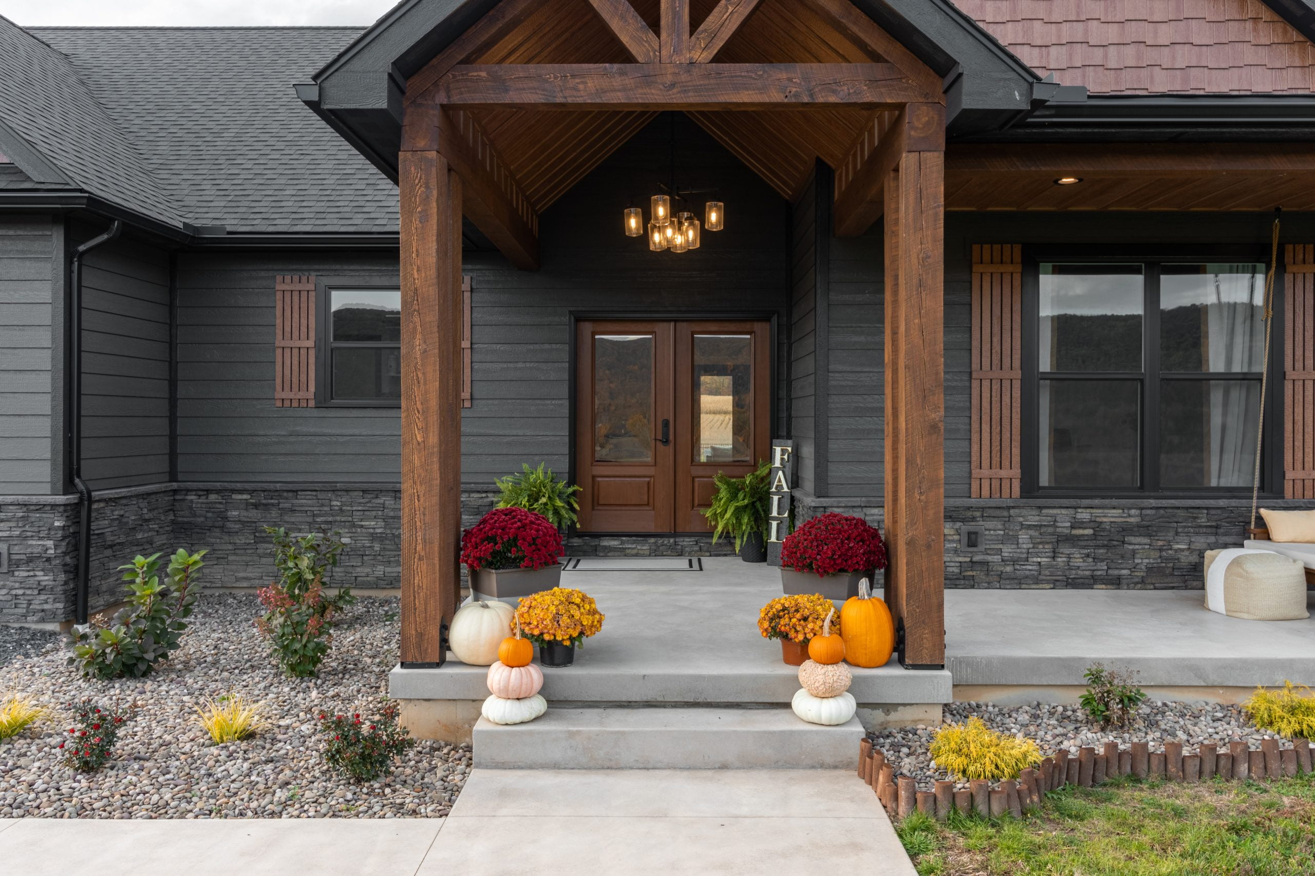 This gorgeous craftsman-style home’s dark siding with natural wood accents stands out from the countryside landscape.
