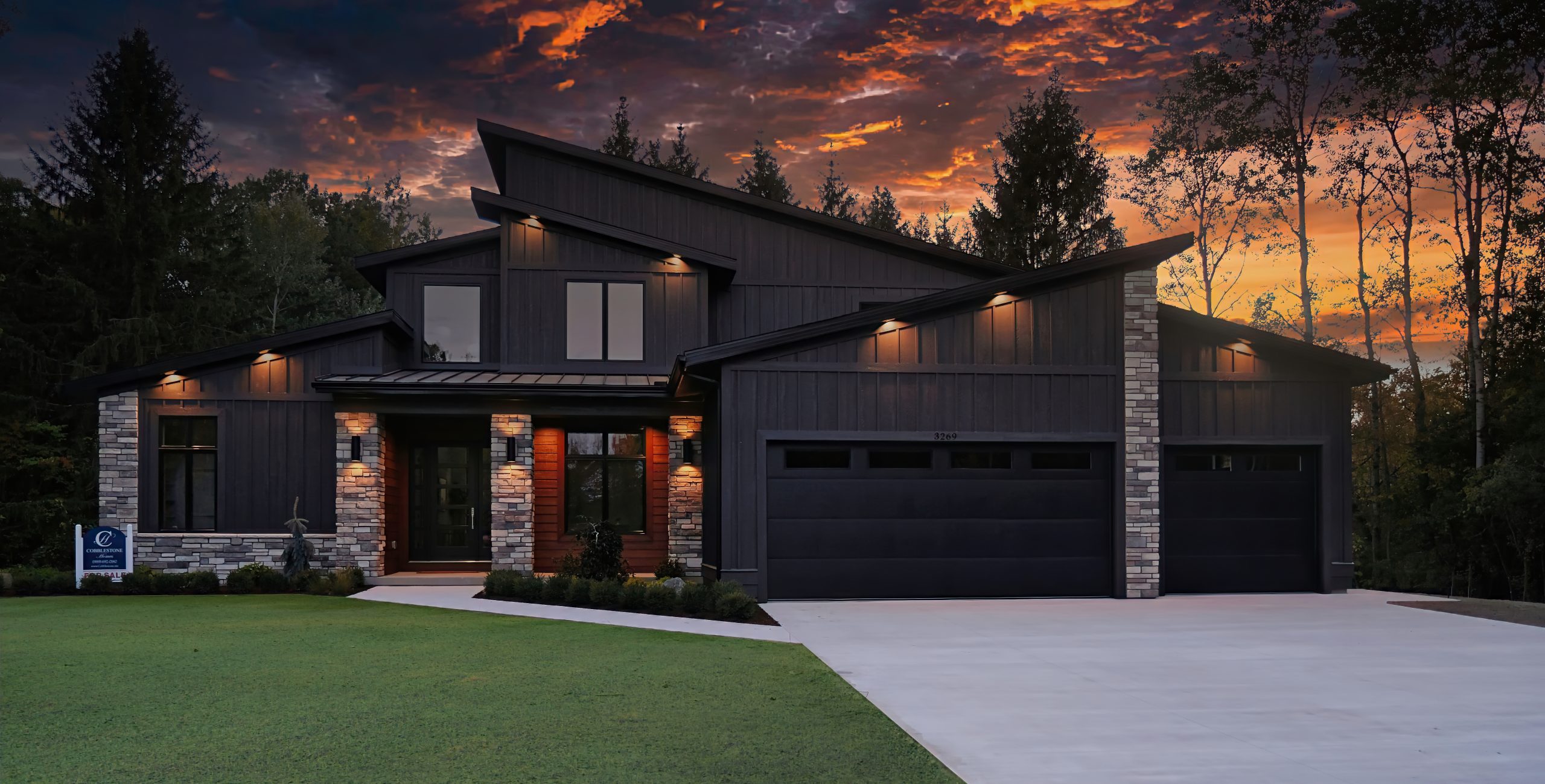 A modern home with dynamic rooflines to add visual interest. The mixed materials of Diamond Kote siding, stone, and metal roofing adds balance to the overall curb appeal.