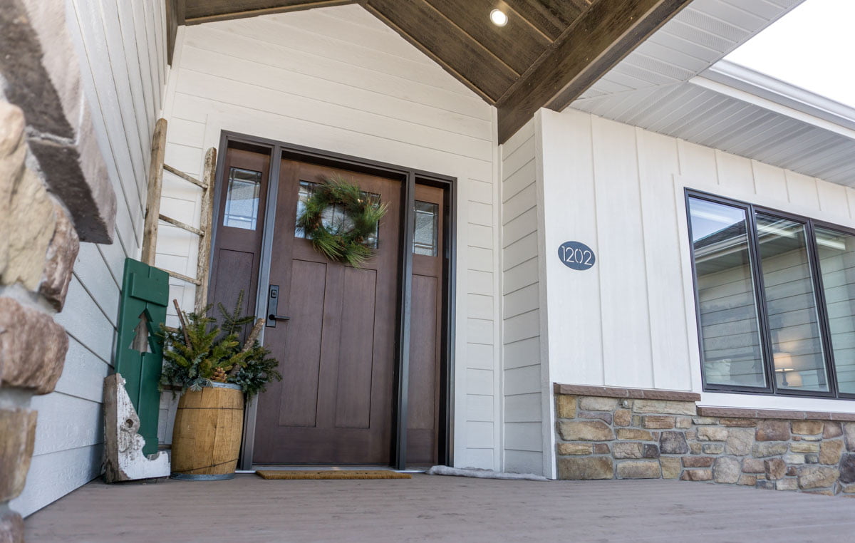 A modern farmhouse with a timeless design. This home features RigidStack lap siding, Board & Batten siding, Staggered Edge RigidShakes, and trim in White. The covered porch showcases Grizzly Board & Batten to complement the color of the door.