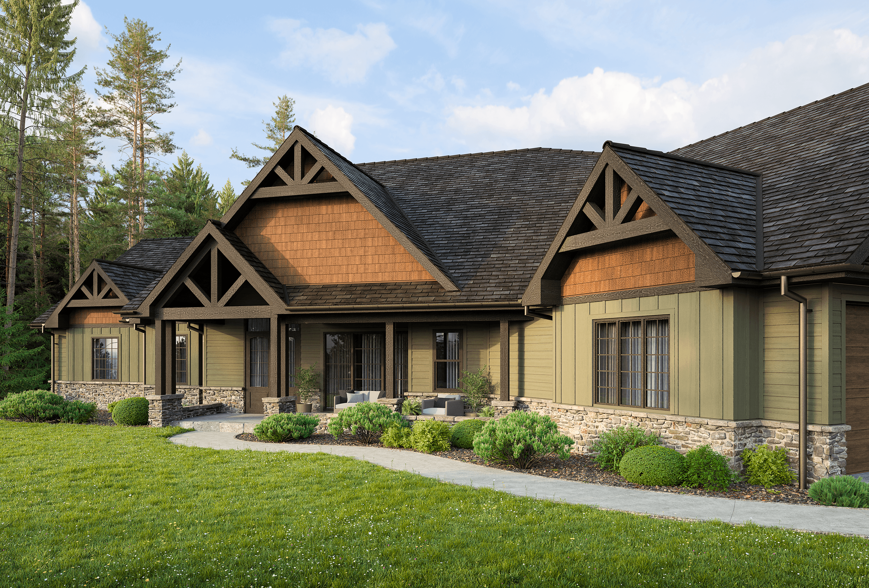 Honeycomb Straight Edge Shakes, Olive Lap Siding, and Board and Batten with Elkhorn trim give the classic mountain home style a modern look.
