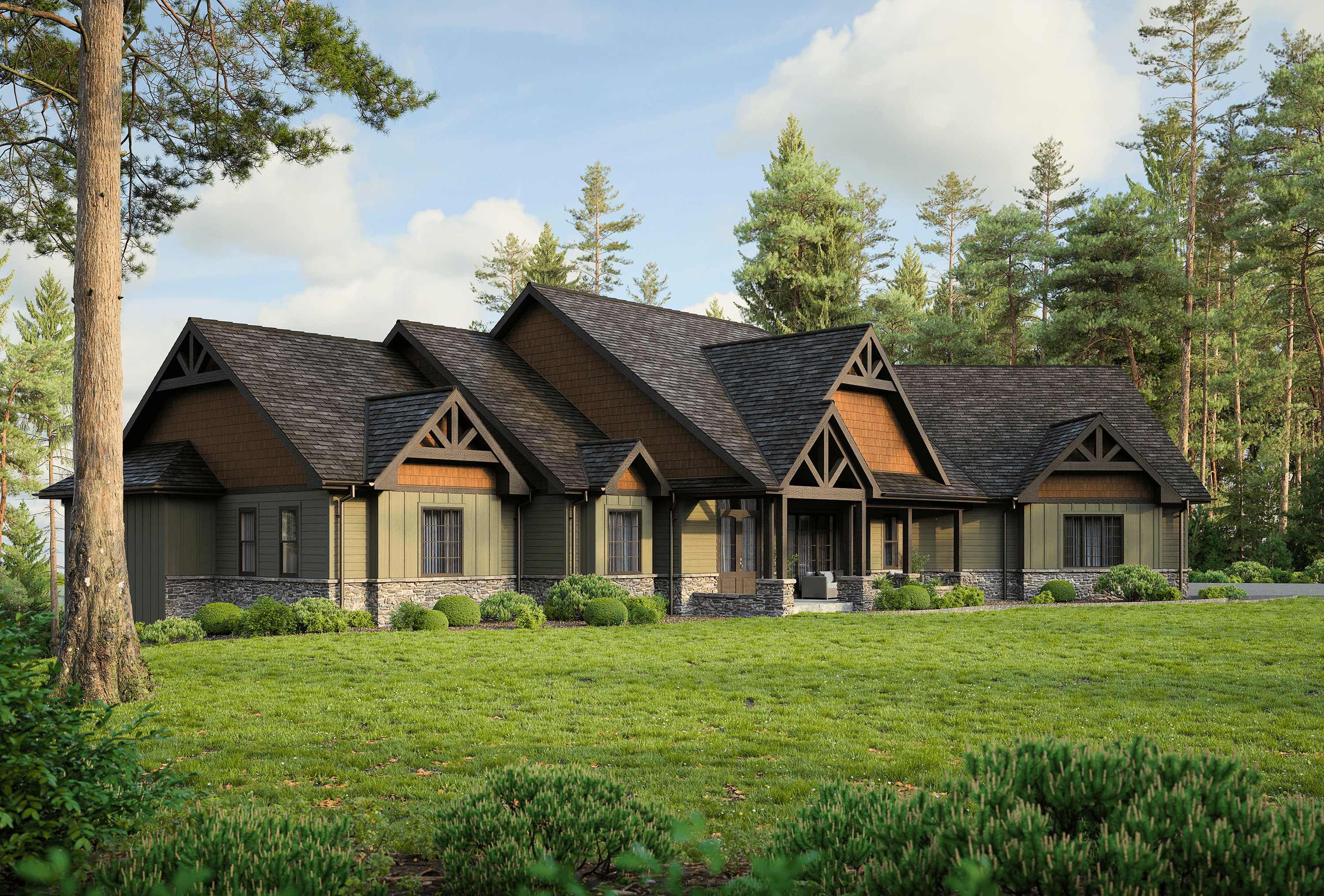 Honeycomb Straight Edge Shakes, Olive Lap Siding, and Board and Batten with Elkhorn trim give the classic mountain home style a modern look.