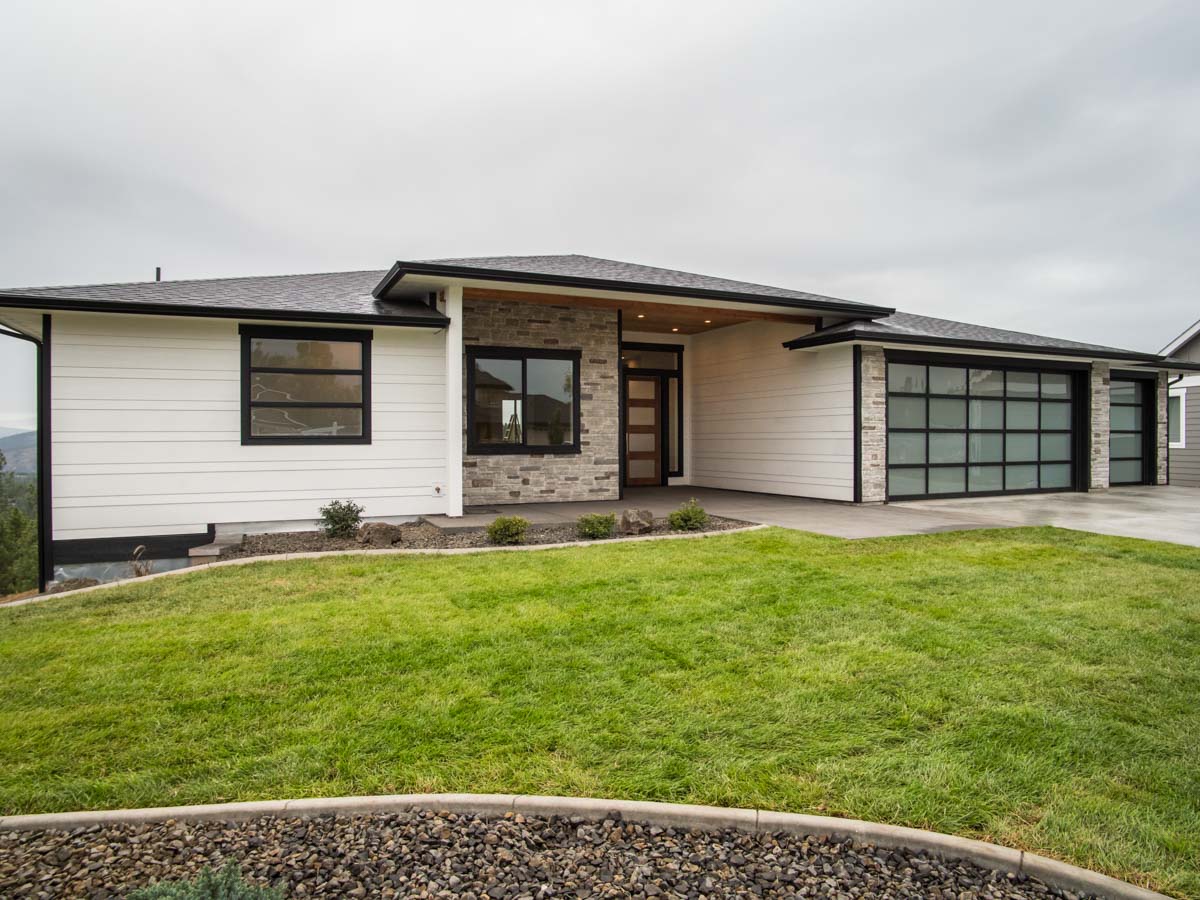 A modern take on texture in design! This home features White multi-exposure RigidStack lap siding with Onyx trim that complements the unique garage doors perfectly.