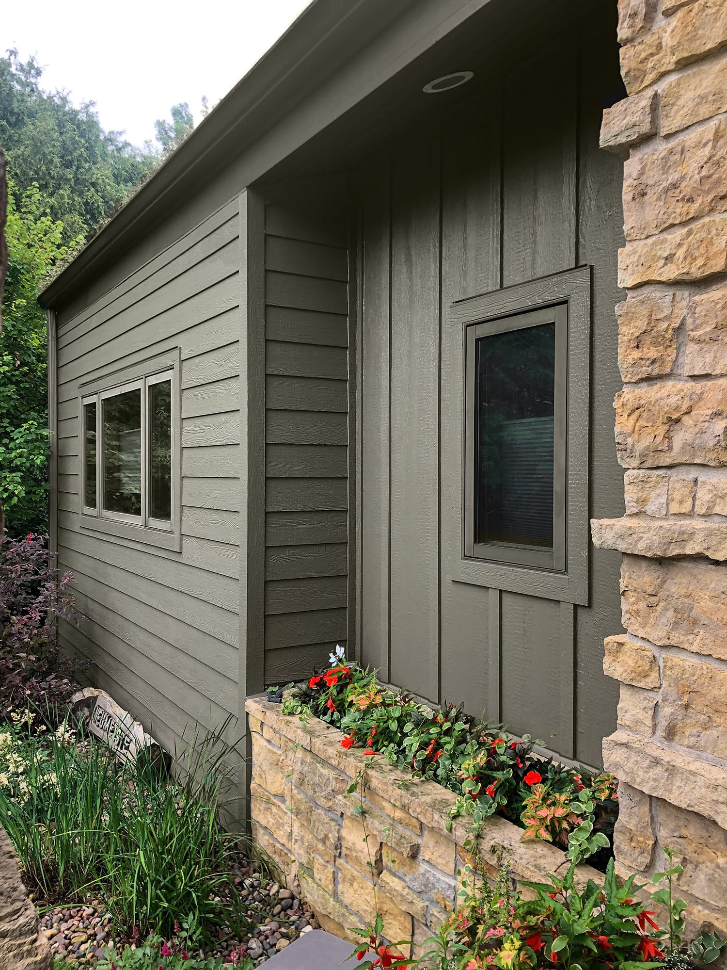 A monochromatic exterior color palette is achieved by using one siding color. Terra Bronze is a taupe color that is enhanced by mixing siding styles, like Lap Siding and Board and Batten.