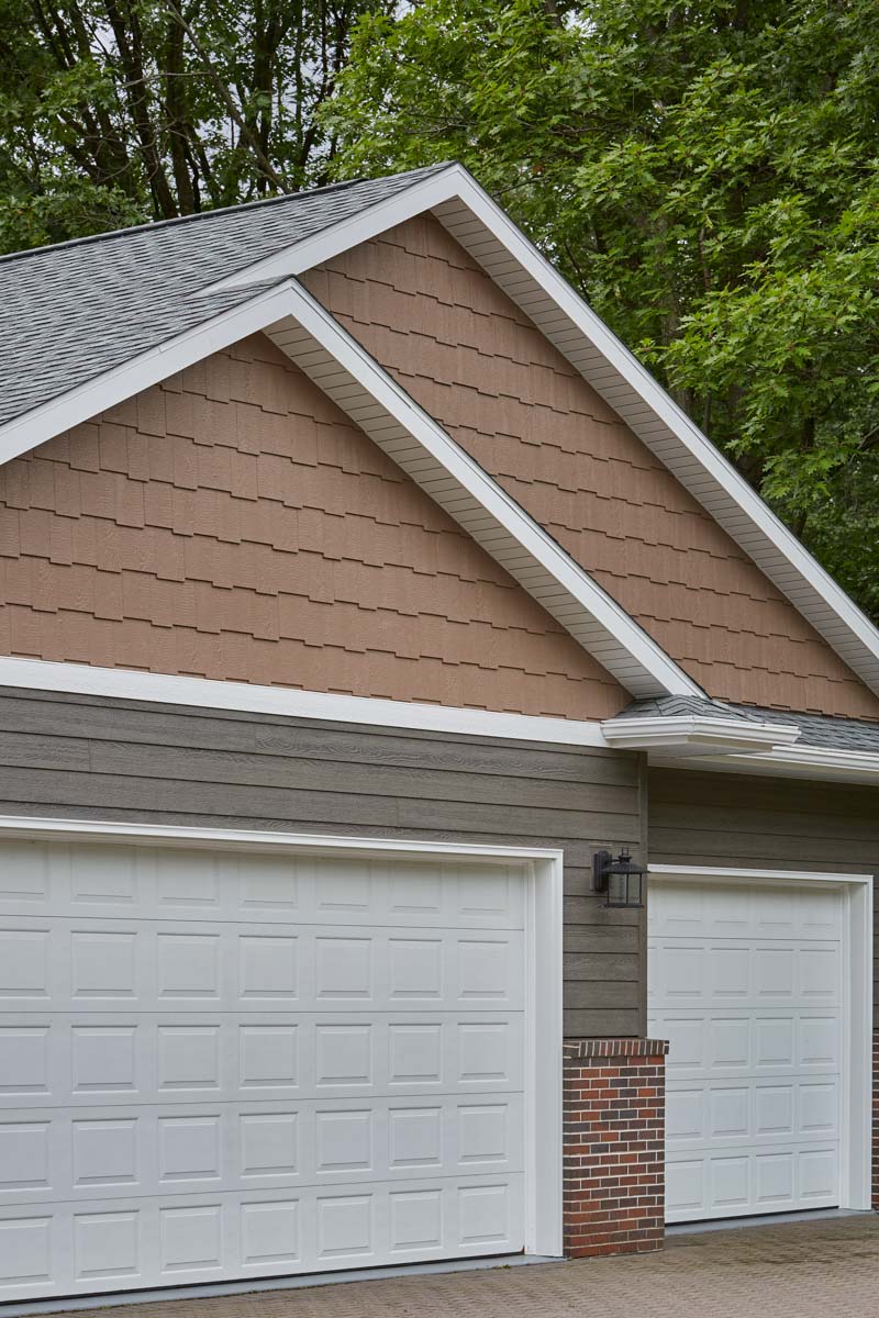 This mountain home has been resided with RigidStack lap siding in Bedrock and Staggered Edge RigidShakes in a custom color. The home also features White band board trim to create separation between the two siding profiles.