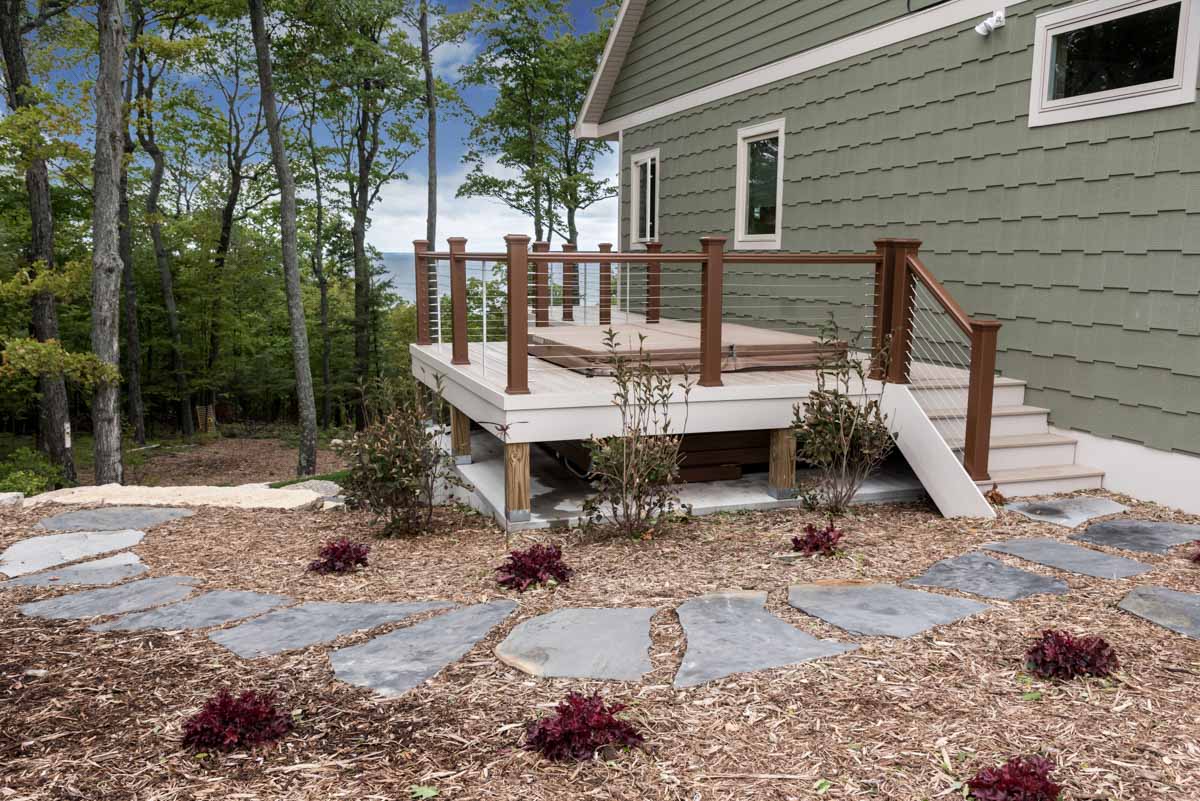 This luxury lakeside home on Lake Michigan features RigidStack lap siding and Staggered Edge RigidShakes in Olive with contrasting trim in Sand. The Sand band board trim is used to create a beautiful transition between the two siding profiles.