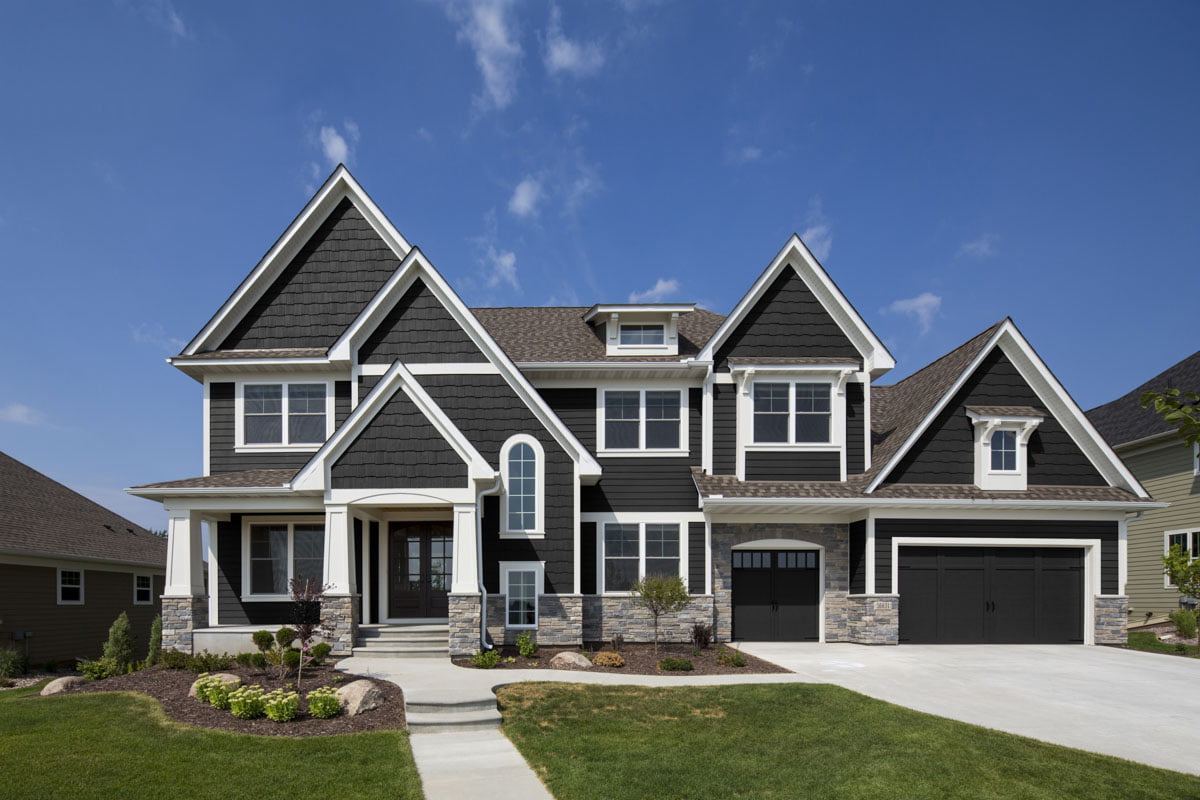 This home features RigidStack lap siding and Staggered Edge RigidShakes in Graphite with White trim. The combination of siding profiles adds depth and dimension for significant curb appeal while the White trim calls out the windows and frame of the house.
