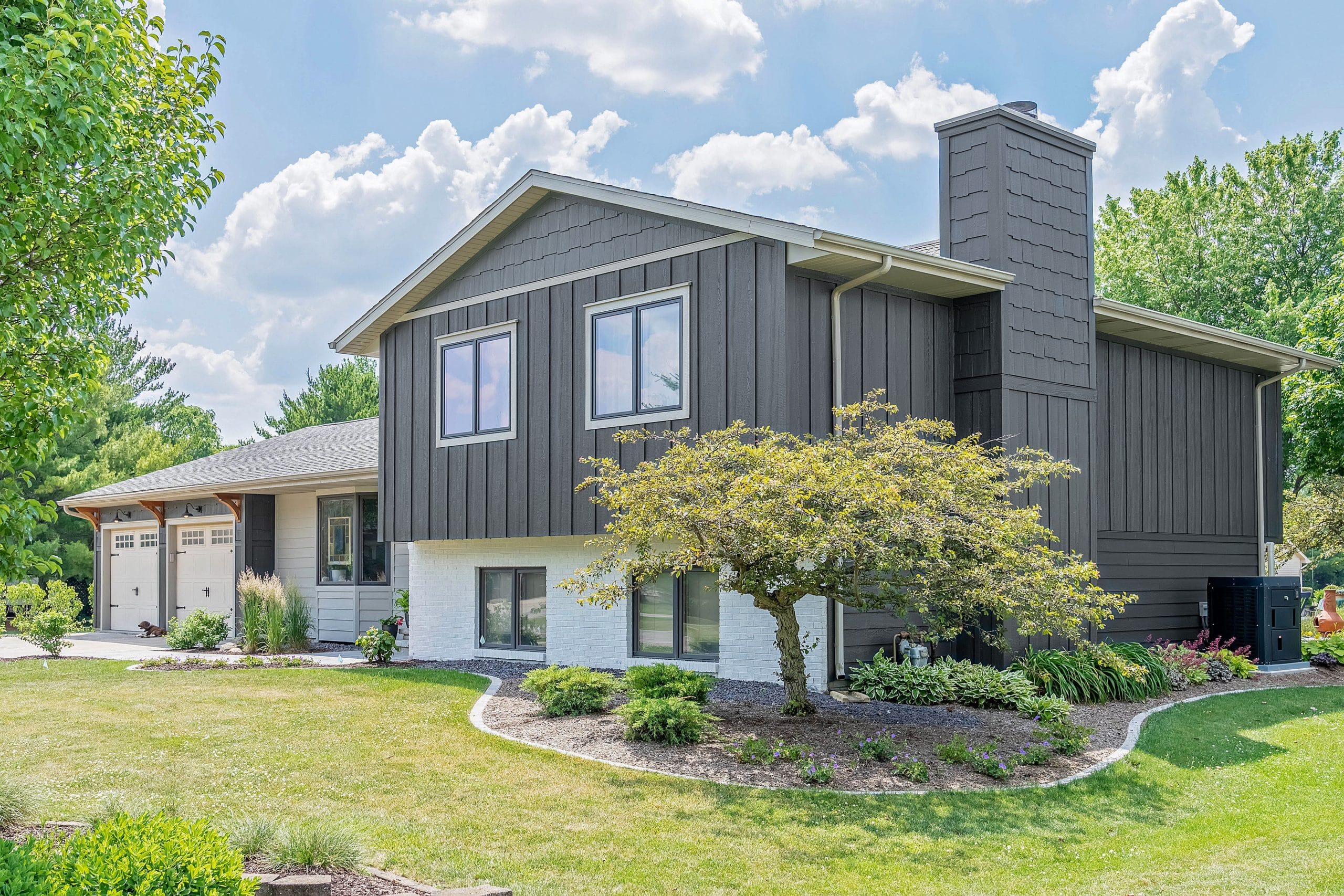 Split-level exterior design reimagined! This split-level reside combines three different siding profiles to create a timeless modern farmhouse look. This home features board and batten siding in Graphite, Staggered Edge RigidShakes in Smoky Ash and RigidStack lap siding in Clay. A Clay band board (or belly band) is used in the upper gable to create separation between the different profiles and make the bold colors pop. The entire design is tied together with color-matched trim in Graphite and complemented with wood corbels for a rustic touch.