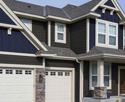 Home features Lap Siding with RigidStack™ in Smoky Ash, Graphite, and Clay, Staggered Edge Shakes with RigidStack™ in Graphite, and Board and Batten in Graphite.