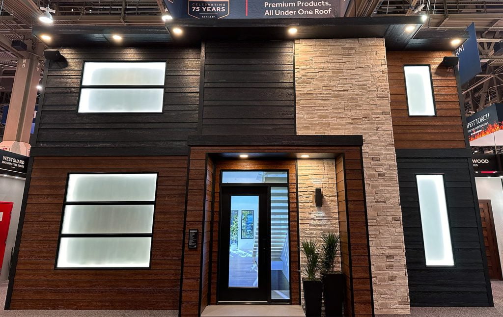 - 18-foot façade showing multiple exposures, real wood-like accents with our DuoBlend Premium color Canyon, Onyx siding, and Versetta Stone.